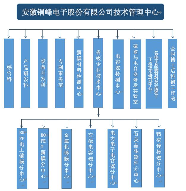 銅峰公司為國家高新技術(shù)企業(yè)、國家火炬計(jì)劃重點(diǎn)高新技術(shù)企業(yè)、國家火炬計(jì)劃銅陵電子材料產(chǎn)業(yè)基地重點(diǎn)骨干企業(yè)。公司建有完整的科研創(chuàng)新組織體系,設(shè)立技術(shù)管理中心作為技術(shù)研發(fā)的總管理機(jī)構(gòu),組織協(xié)調(diào)公司的各分子公司和相關(guān)部門,以確保公司技術(shù)創(chuàng)新精確高效地運(yùn)行。技術(shù)管理中心下設(shè)綜合科、產(chǎn)品研發(fā)科、設(shè)備開發(fā)科、專利事務(wù)室、薄膜材料檢測(cè)中心、電容器檢測(cè)中心以及薄膜與電容器研發(fā)實(shí)驗(yàn)室,同時(shí)下設(shè)省級(jí)企業(yè)技術(shù)中心、安徽省電子基礎(chǔ)材料及元器件工程技術(shù)研究中心以及國家級(jí)博士后科研工作站。